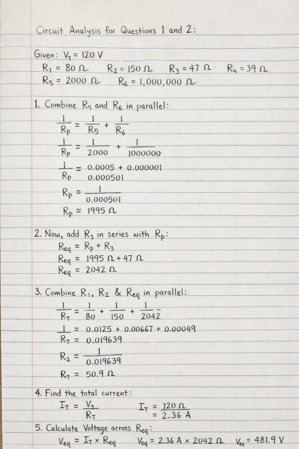 Circuit Analysis for Questions 1 and 2: The circuit consists of a voltage source V_T = 120 V and resistors R_1 = 80 \, , R_2 = 150 \, , R_3 = 47 \, , R_4 = 39 \, , R_5 = 2 \, k = 2000 \, , and R_6 = 1 \, M = 1000000 \, .