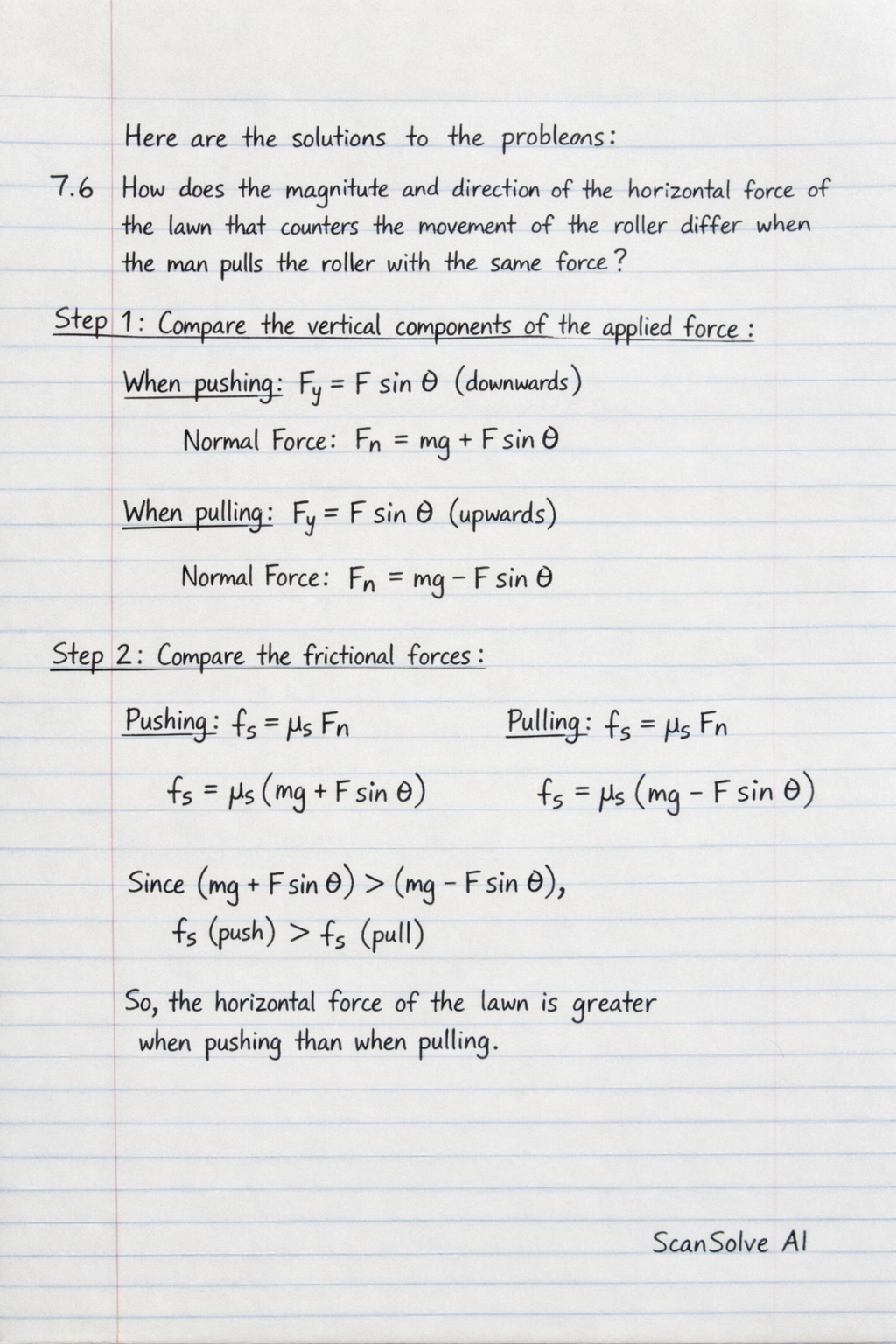 7.6 How does the magnitude and direction of the horizontal force of the lawn that counters the movement of the roller in Question 7.5 differs to when the man pulls the roller with the same force?