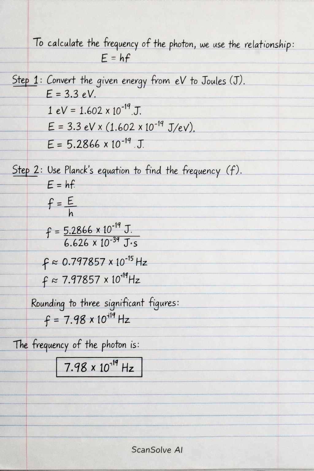 To calculate the frequency of the photon, we use the relationship between energy and frequency for a photon, E=hf.