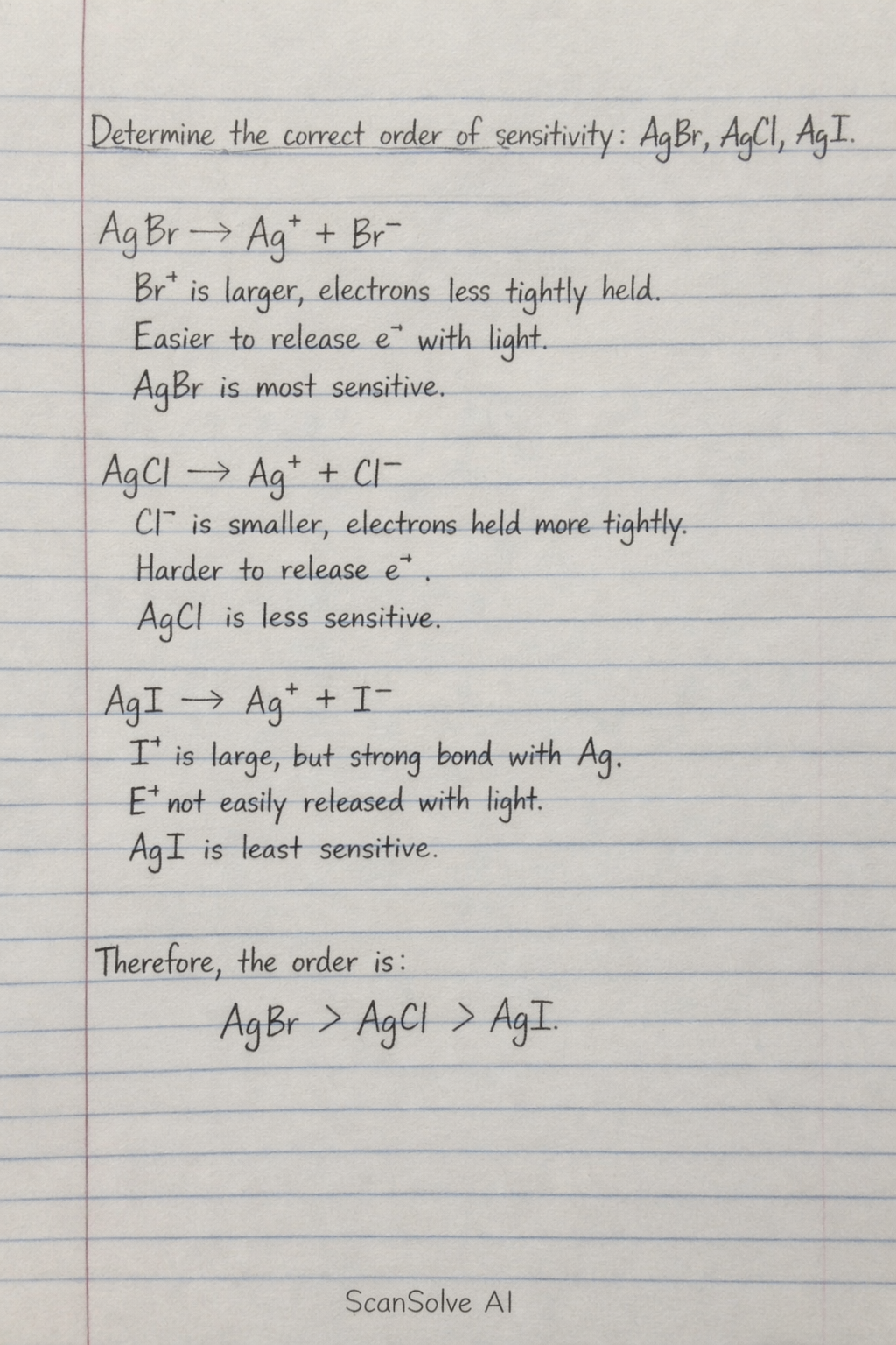 Correct Answer: (C) agbr > agcl > agi πππ₯πππ¨π ππ«π£πππ‘ππ§ππ’π‘ π’π πππππ§ π₯ππππ§ππ’π‘ β€ What is light sensitivity? - Light sensitivity means how fast a substance breaks when light shines on it. - Faster breaking = higher sensitivity. β€ What happens in the reaction? - Light supplies energy. - The compound breaks into silver and halogen gas. Example: agbr β ag + brβ (in light) β€ Now, the real thinking test - The question is: which one breaks fastest when light hits it? β€ Why most students choose (A) or (B) - They think: βiodine is bigger β so agi should react fastestβ - This looks logical, but it is a wrong assumption. > Bigger atom does NOT always mean faster reaction. β€ What actually matters - How easily electrons can move when light hits the compound - Not just size of the atom β€ The correct scientific behaviour - agbr β releases electrons very easily β reacts fastest - agcl β reacts, but slower - agi β holds electrons strongly β reacts slowest β€ Strong proof you cannot ignore - Cameras use agbr (silver bromide) - Because it reacts quickly to light and forms images fast Now think carefully: > If agi was truly the most sensitive, why is it not used in photography? That question exposes why (A) and (B) are wrong. β€ Final correct order - agbr β most sensitive - agcl β moderate - agi β least sensitive > agbr > agcl > agi β€ Why (A) is wrong - It wrongly puts agi as the fastest β€ Why (B) is wrong - It wrongly places agbr as the slowest β€ Simple Tip - βBr = Best with lightβ β agbr is number one TAP β€οΈ & SHARE IF THIS WAS HELPFUL