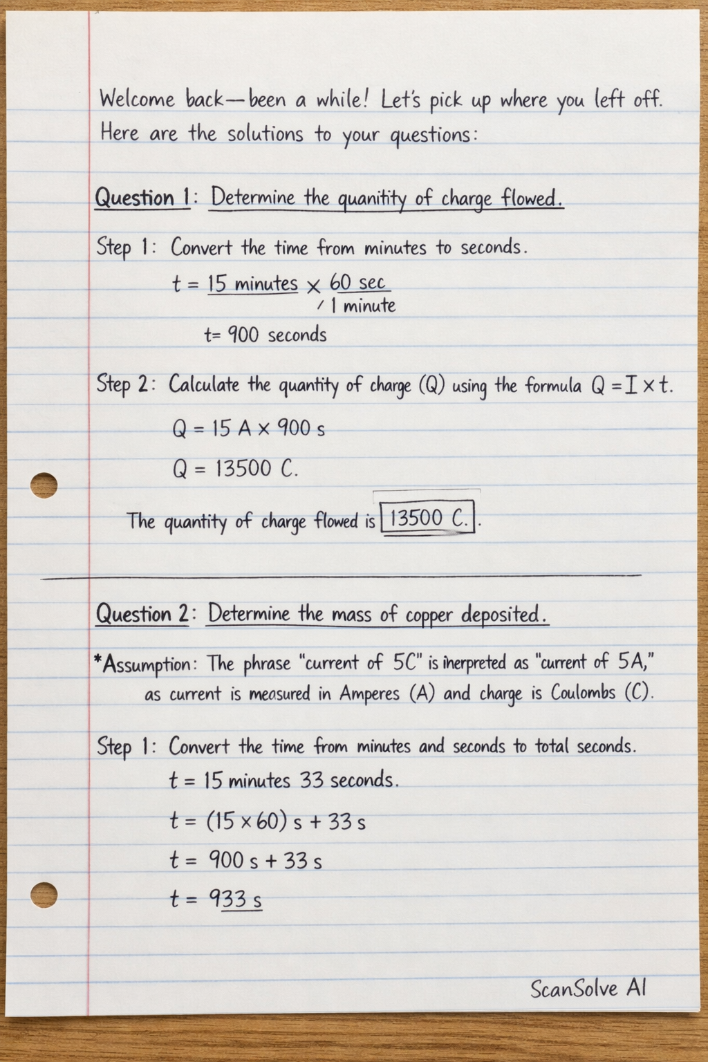 Welcome back — been a while! Let's pick up where you left off. Here are the solutions to your questions: Question 1: Determine the quantity of charge flowed.