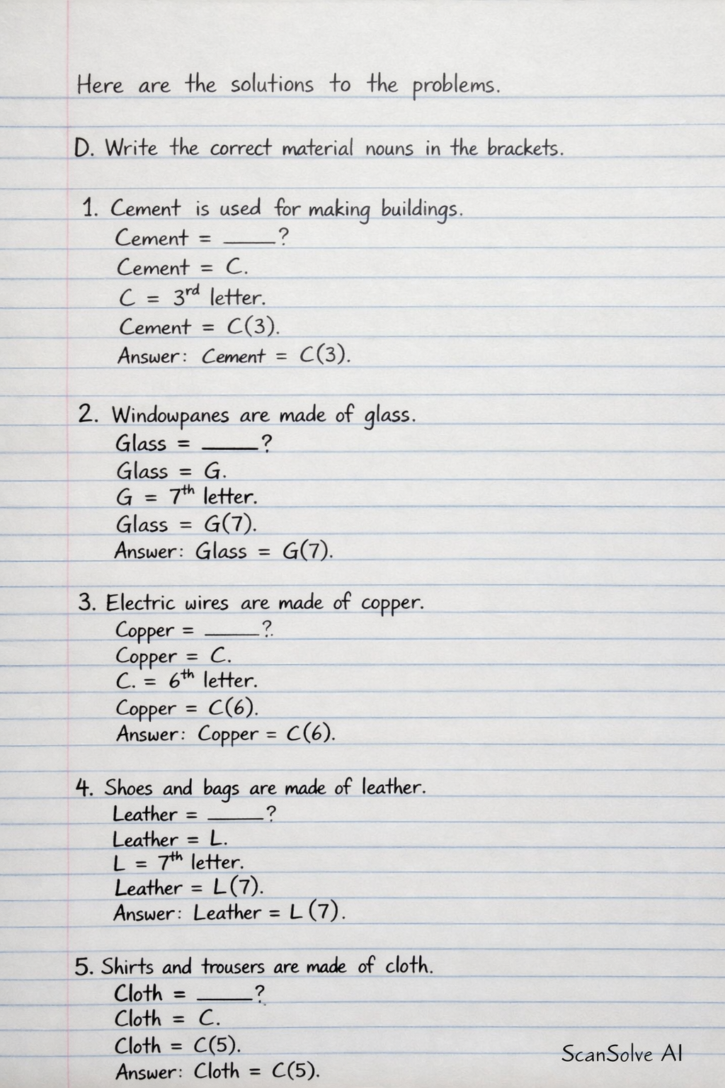 Write the correct material nouns in the brackets. 1. (cement, soil, paper) is used for making buildings. 2. Windowpanes are made of (steel, glass, wood). 3. Electric wires are made of (iron, steel, copper). 4. Shoes and bags are made of (steel, gold, leather). 5. Shirts and trousers are made of (cloth, cement, paper).