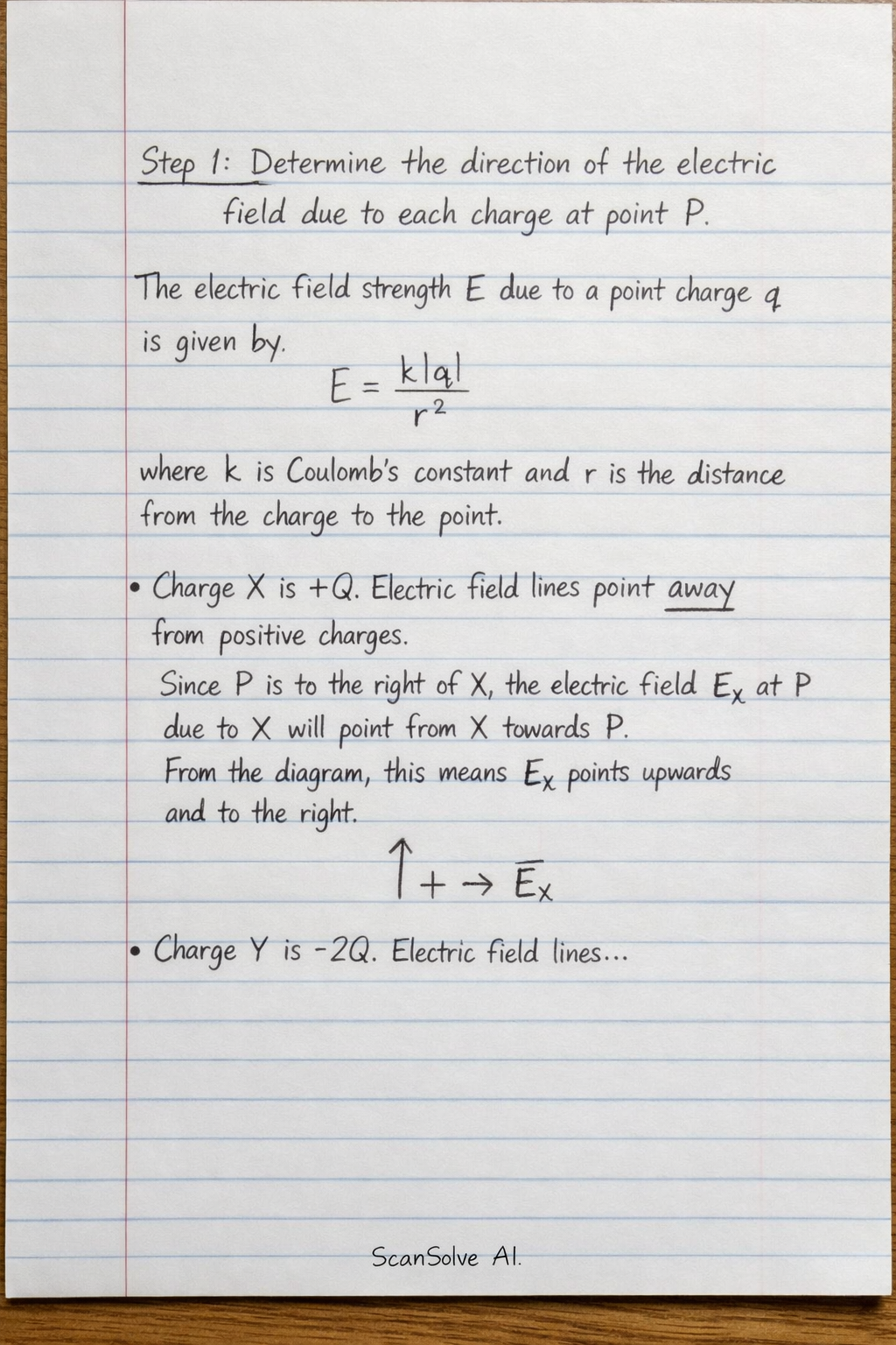 • Charge X is +Q. Electric field lines point away from positive charges. Since P is to the right of X, the electric field EX at P due to X will point from X towards P. From the diagram, this means EX points upwards and to the right.