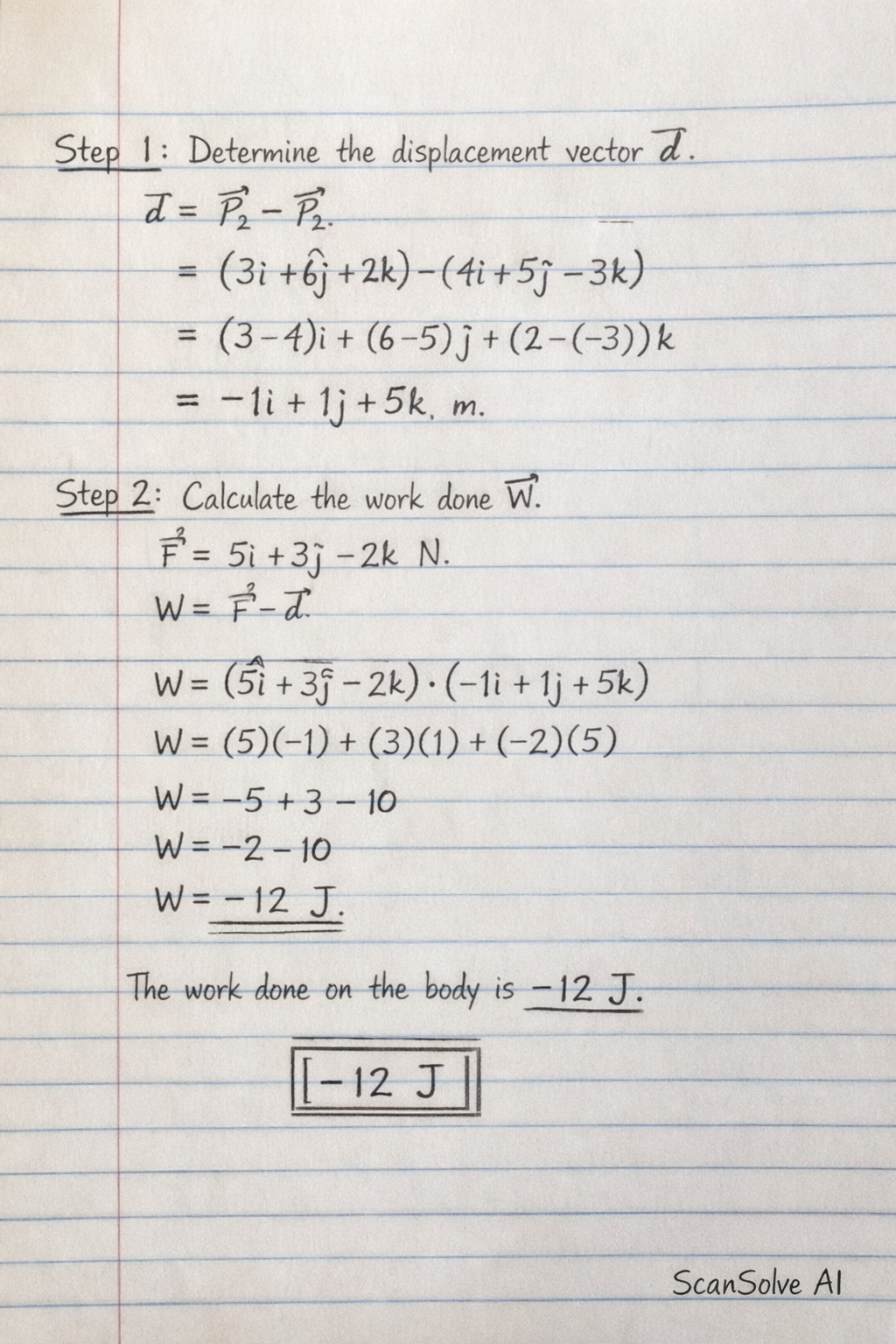 Step 2: Calculate the work done . The force vector is N. The work done by a constant force is the dot product of the force vector and the displacement vector: .