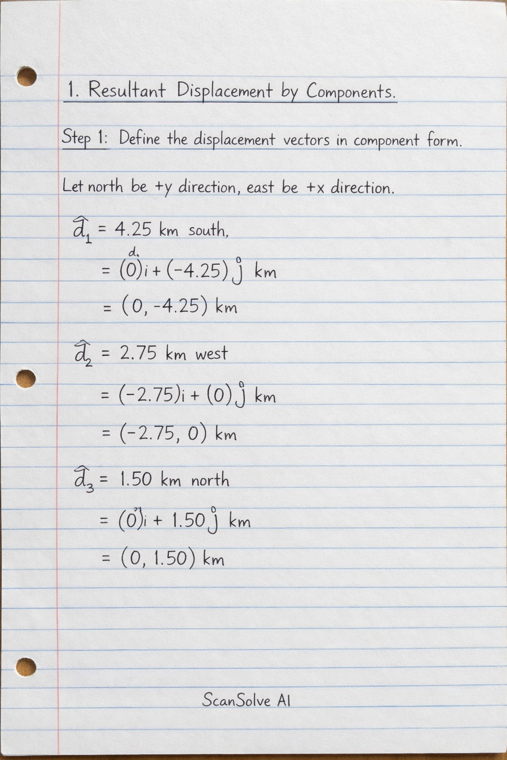 $\vec{d_1} = 4.25 \text{ km south} = (0)\hat{i} + (-4.25)\hat{j} \text{ km}$