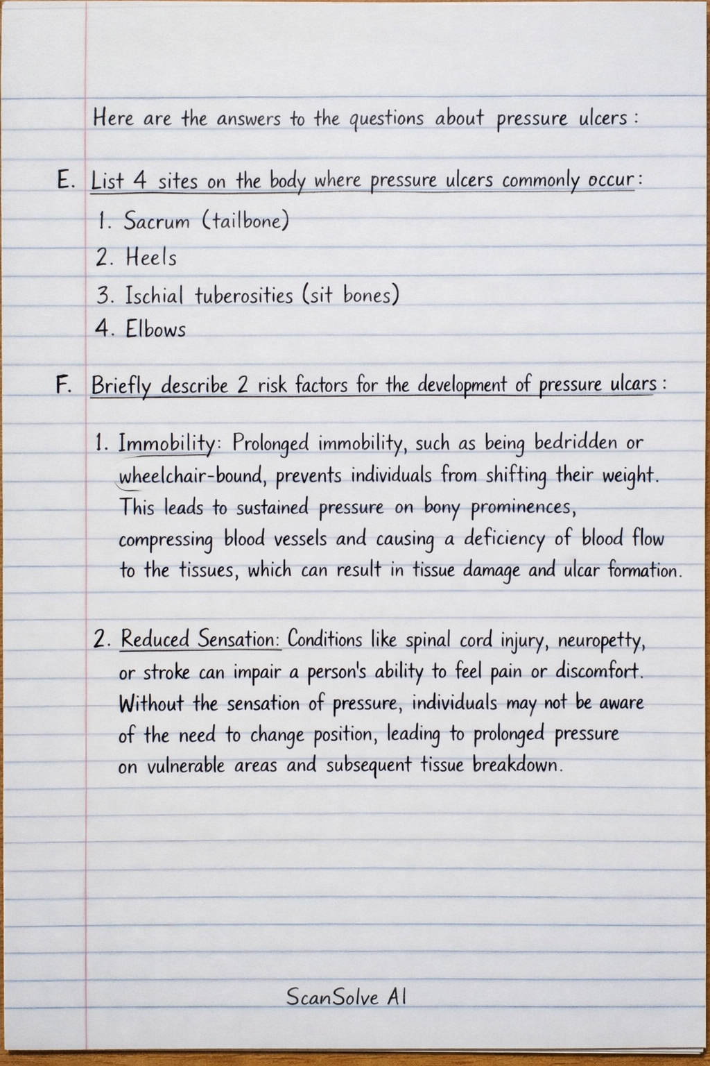 F. Briefly describe 2 risk factors for the development of pressure ulcers.