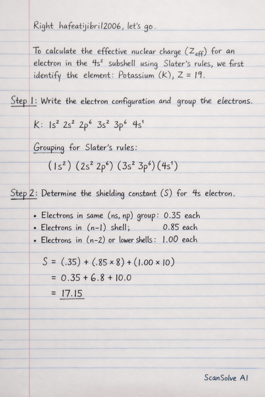 To calculate the effective nuclear charge (Zeff) for an electron in the 4s1 subshell using Slater's rules, we first need to identify the element and its electron configuration. The 4s1 subshell indicates that the element is Potassium (K), which has an atomic number (Z) of 19.