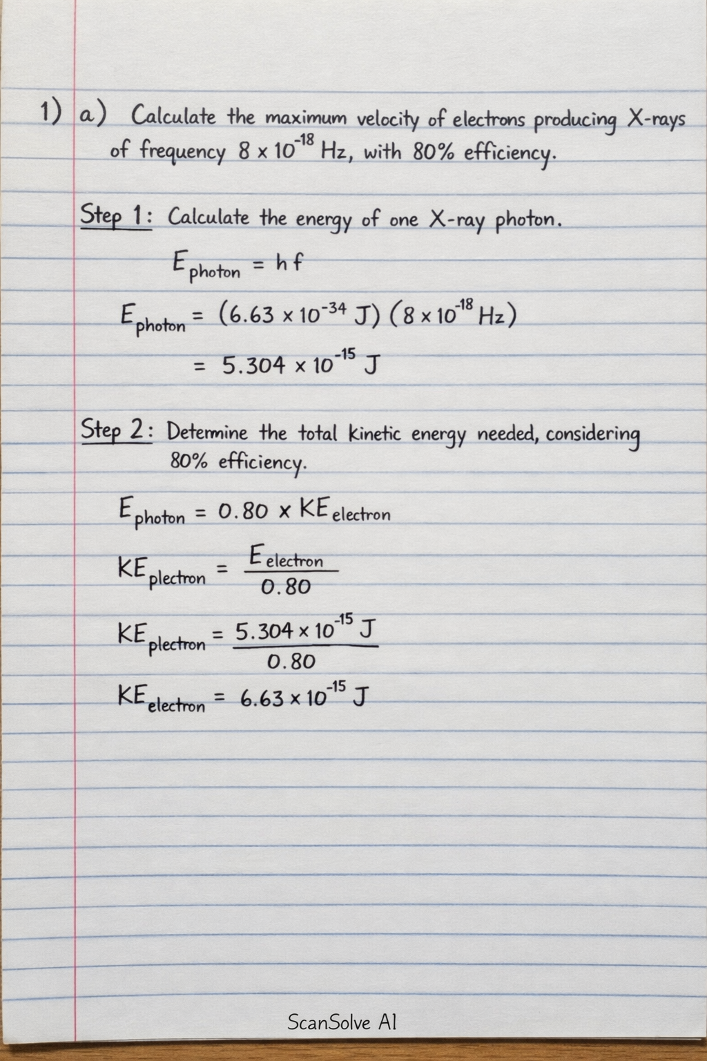 1) a) Calculate the maximum velocity of electrons that would produce X-rays of frequency 8 × 10^18 Hz if only 80% of kinetic energy is converted to X-rays.