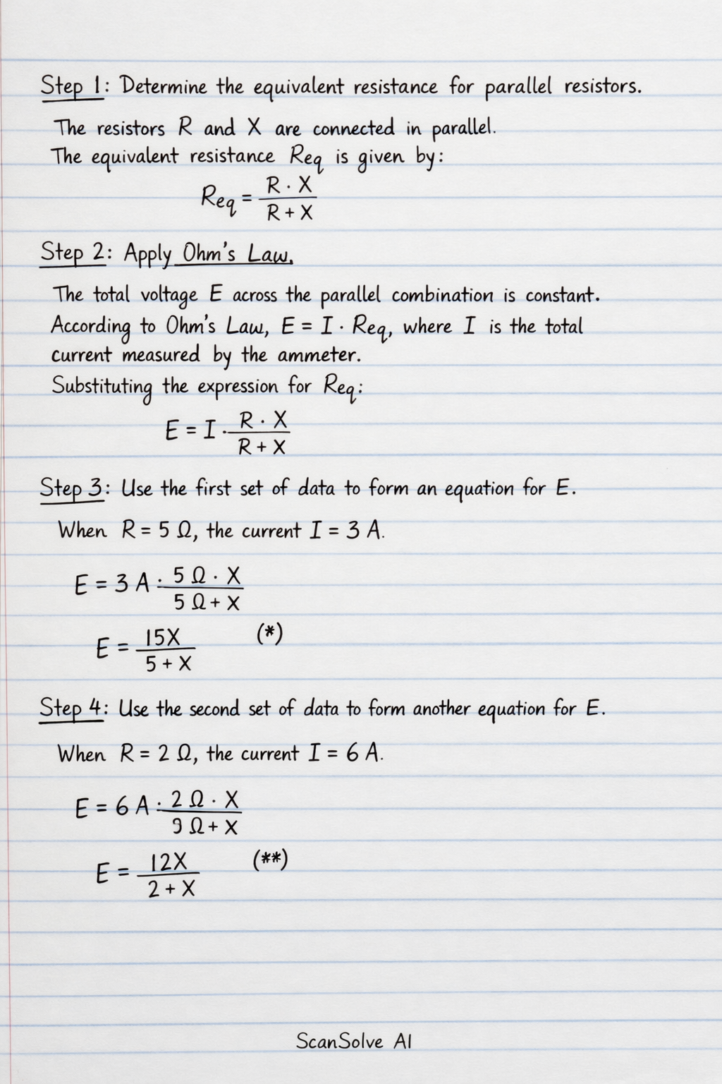 The resistors R and X are connected in parallel. The equivalent resistance Req is given by: