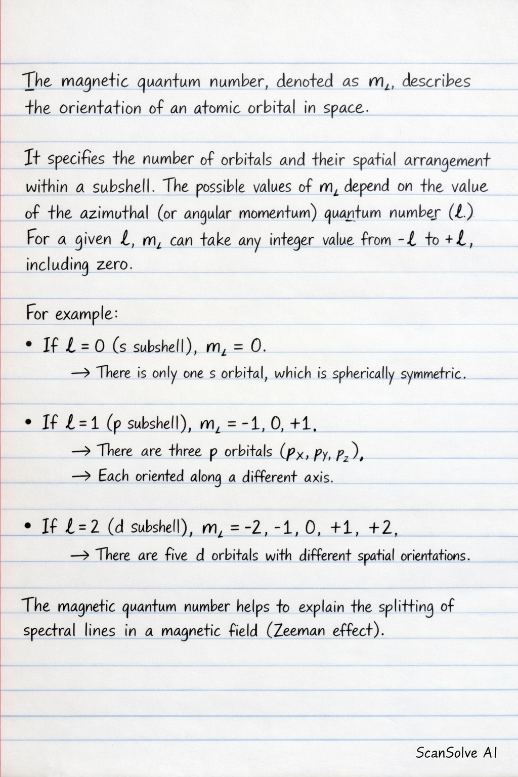 It specifies the number of orbitals and their spatial arrangement within a subshell. The possible values of depend on the value of the azimuthal (or angular momentum) quantum number (). For a given , can take any integer value from to , including zero.