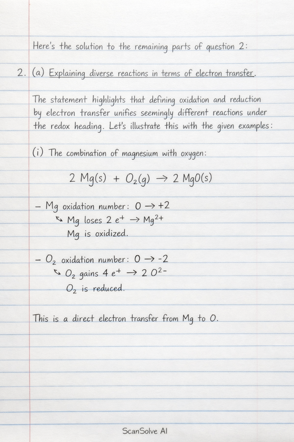 (i) The combination of magnesium with oxygen: • Magnesium's oxidation number changes from to , meaning it loses electrons (oxidized). • Oxygen's oxidation number changes from to , meaning it gains electrons (reduced). This is a direct electron transfer from Mg to O.