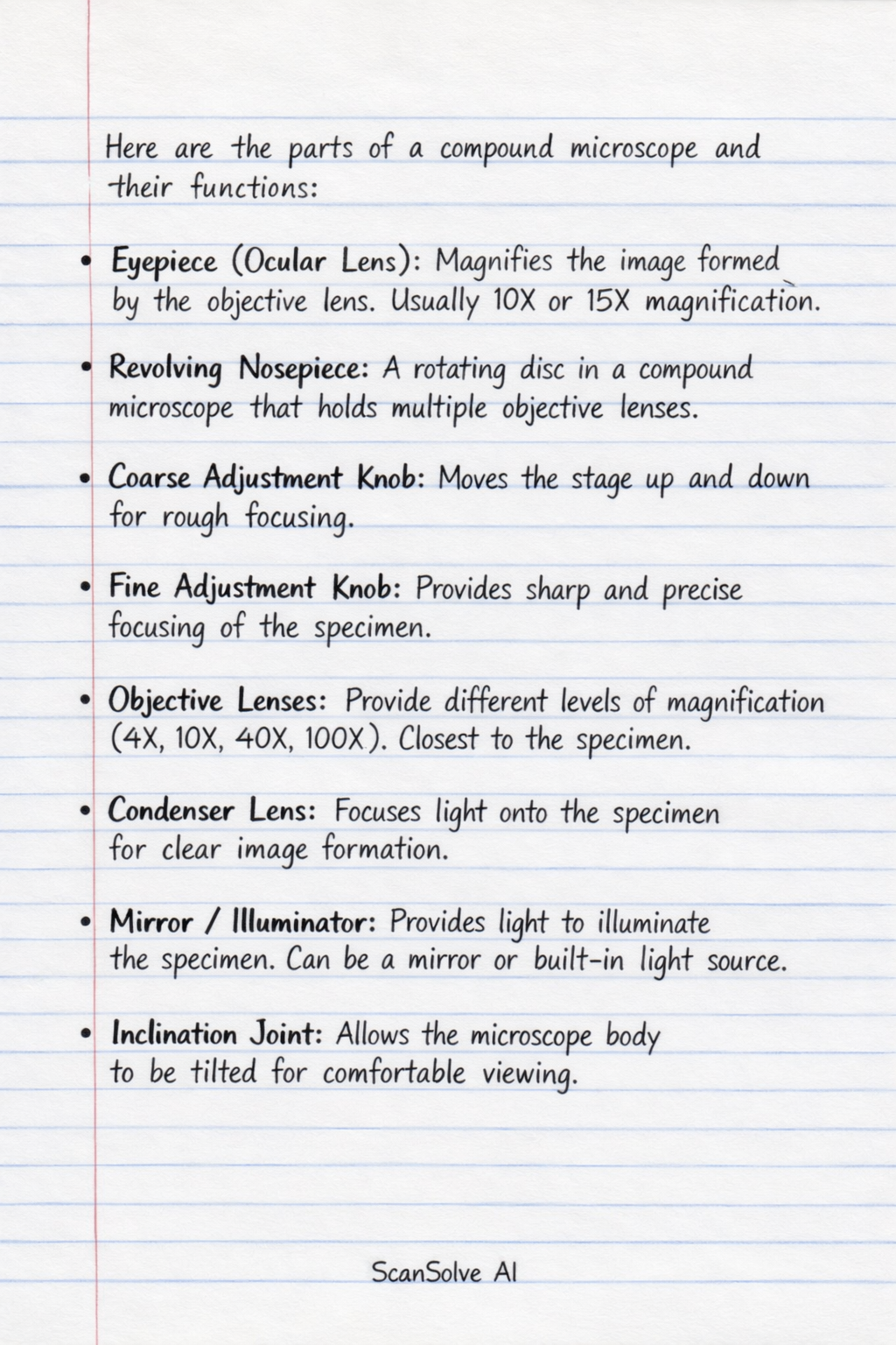Objective Lenses*: Provide different levels of magnification (4X, 10X, 40X, 100X). Closest to the specimen.