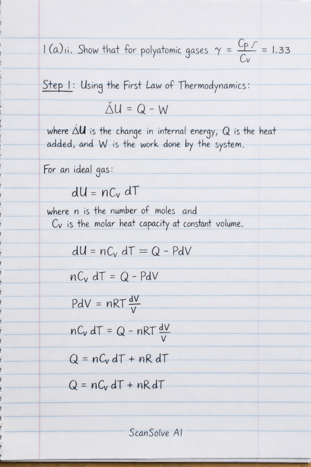 1. (a) i. Starting with the first law of thermodynamic show that for polyatomic gases γ=CvCp=1.33