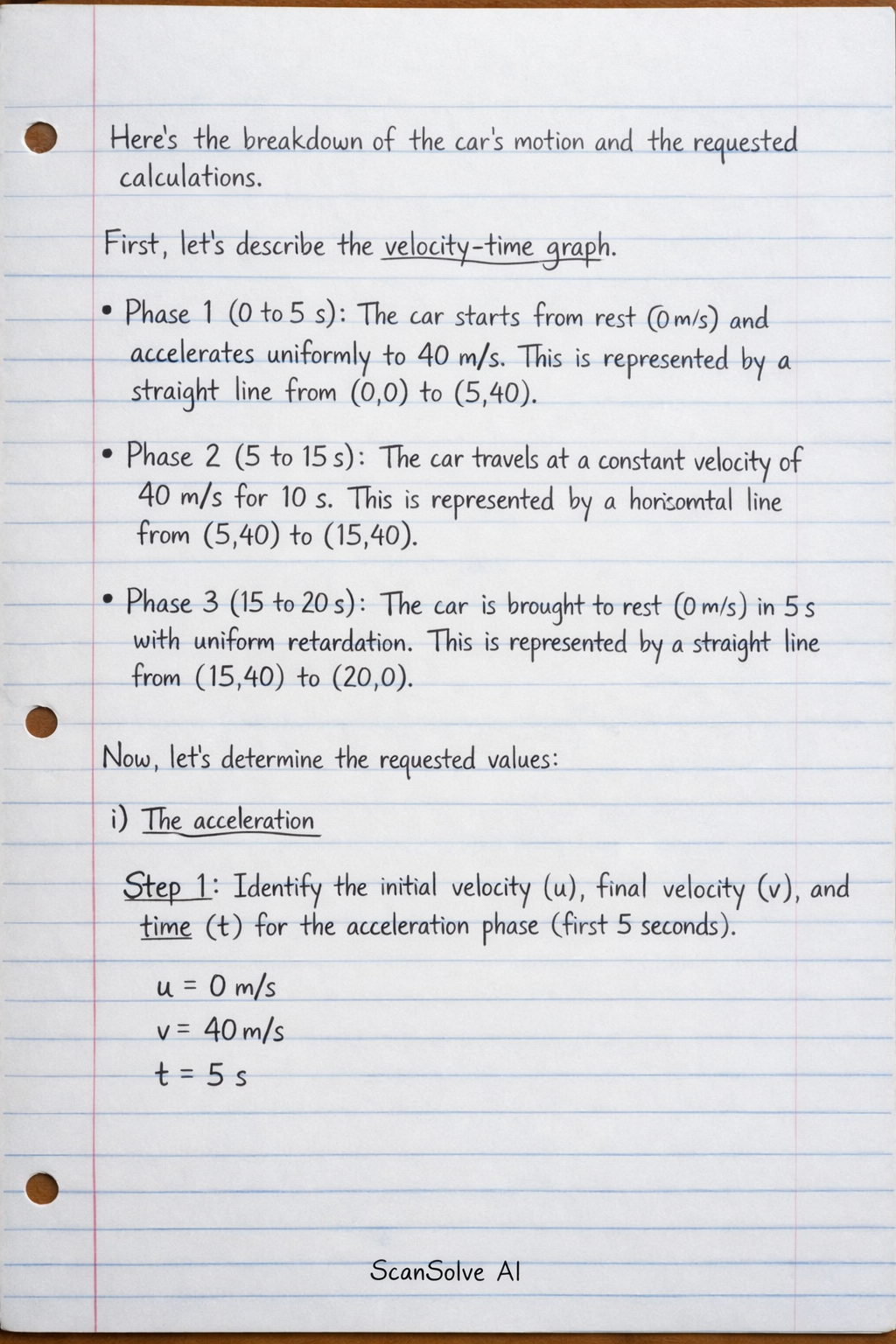 ii) The retardation Step 1: Identify the initial velocity (), final velocity (), and time () for the retardation phase (last 5 seconds). The car's velocity before retardation is .