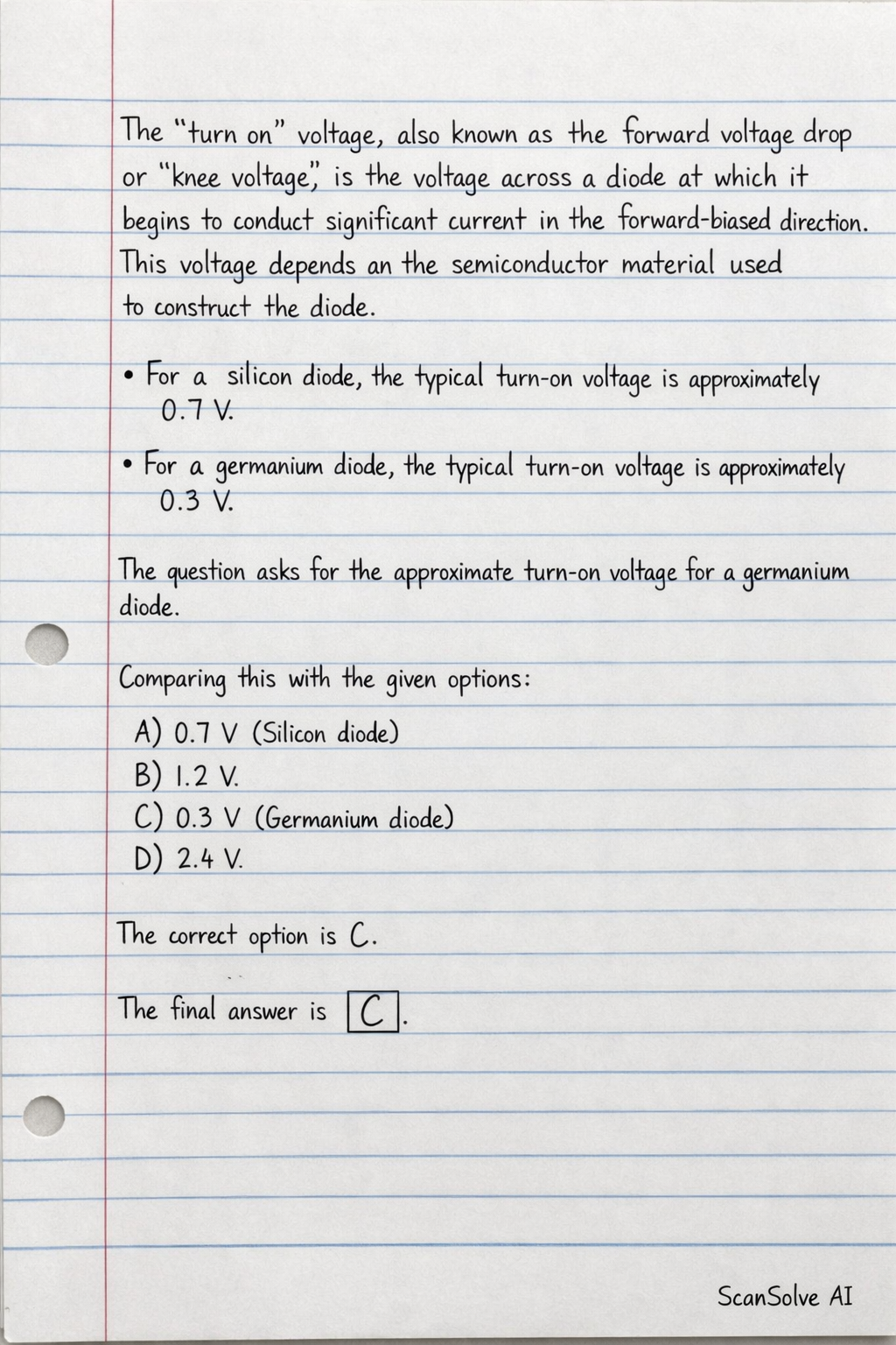 The question asks for the approximate turn-on voltage for a germanium diode.