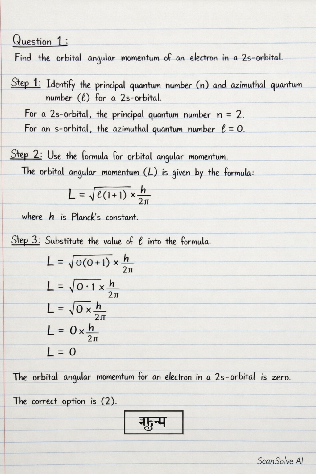 Step 3: Substitute the value of into the formula. Substitute into the formula: The orbital angular momentum for an electron in a 2s-orbital is zero.