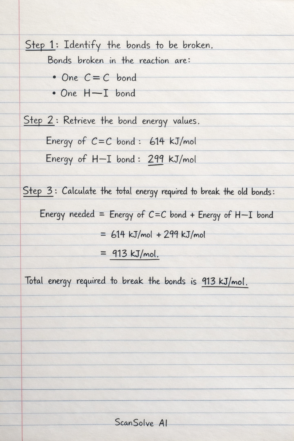 VerifiedTo calculate the total energy required when old bonds are broken, we need to know the specific chemical reaction taking place. Since the reaction is not provided, we will assume a common addition reaction involving an alkene and hydrogen iodide (HI), as the bond energies for , , and are given in the table.
