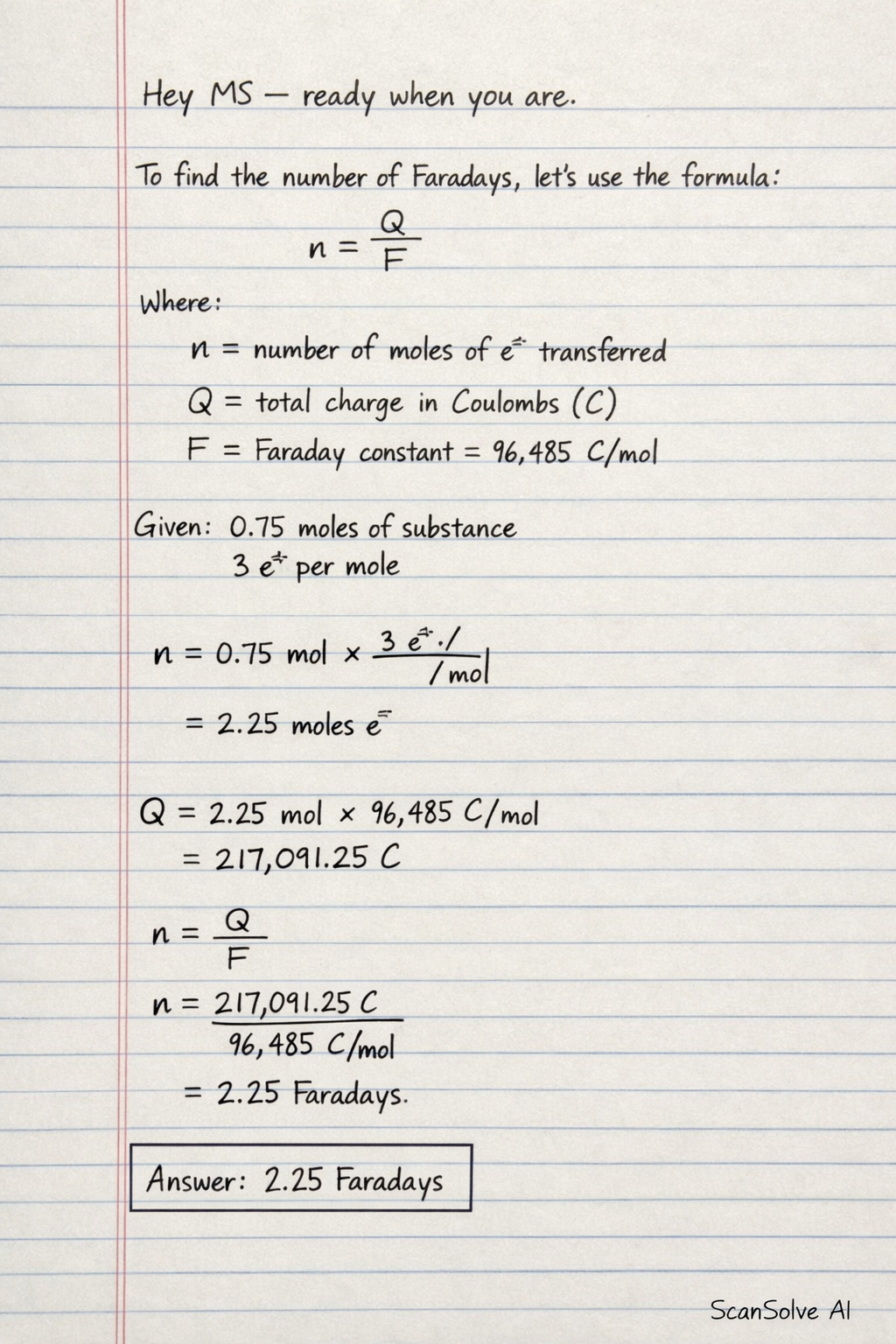 This gives you the number of moles of electrons, which is equivalent to the number of Faradays.