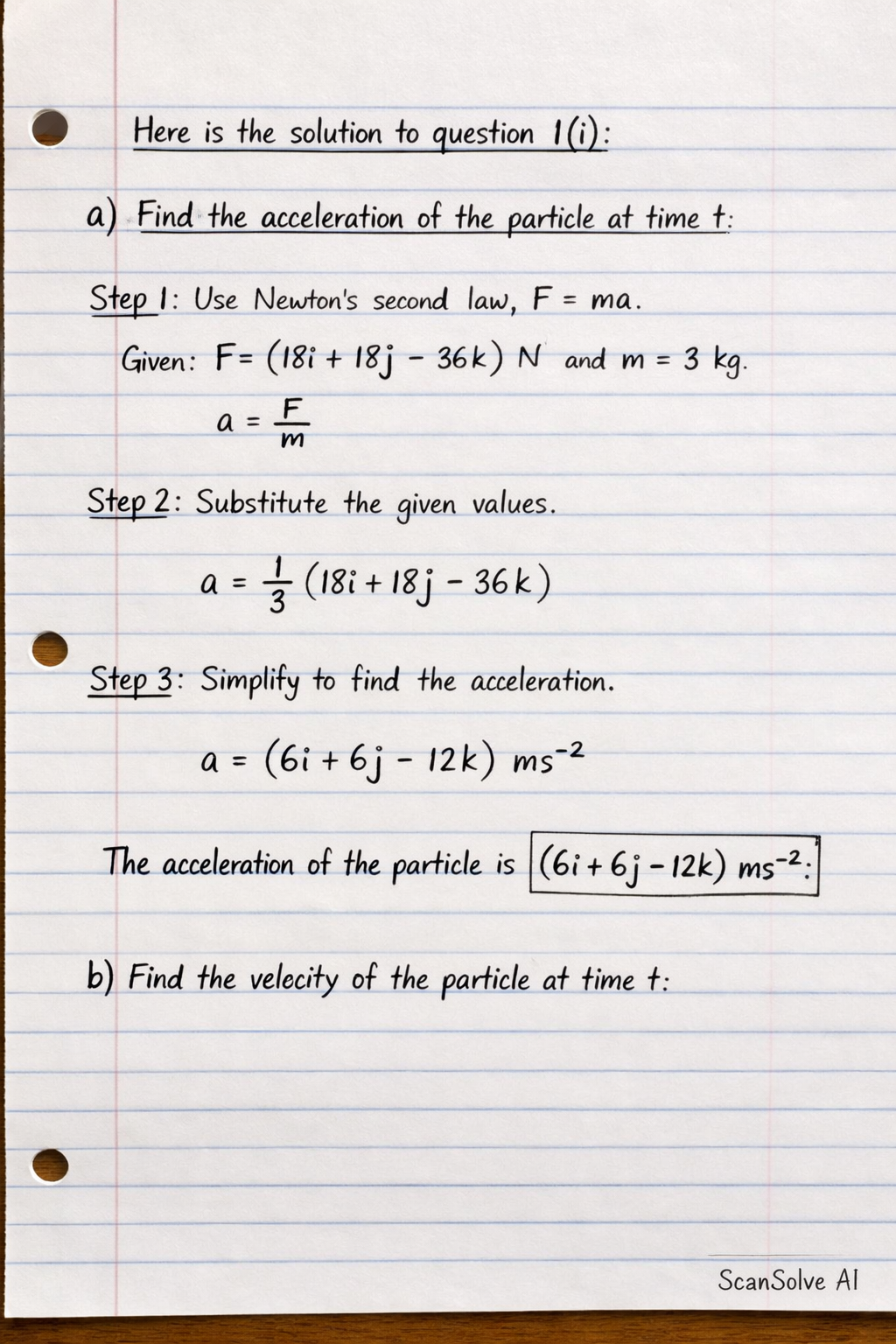 1(i) A force $\mathbf{F} = (18\mathbf{i} + 18\mathbf{j} - 36\mathbf{k})$ N acts at time $t$ seconds on a particle of mass 3kg. Initially, the particle is at the origin moving with velocity $(2\mathbf{i} - \mathbf{j} - 3\mathbf{k})$ ms$^{-1}$.