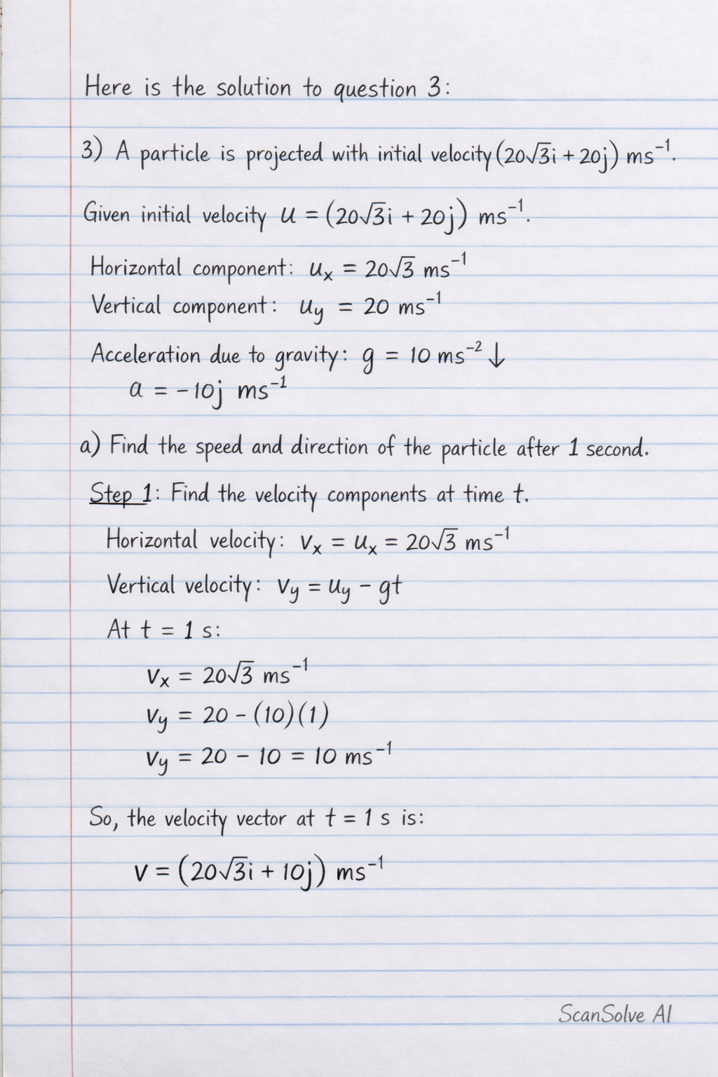 3) A particle is projected with initial velocity (203i+20j) ms−1.