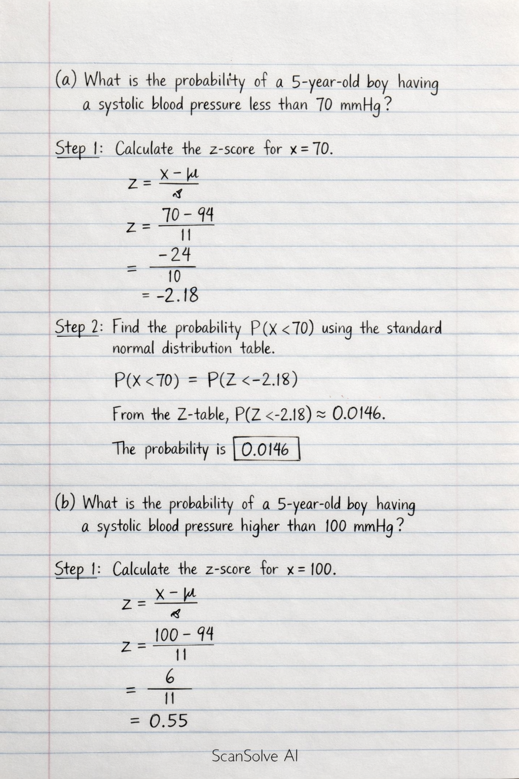 (a) What is the probability of a 5-year-old boy having a systolic blood pressure less than 70 mmHg?