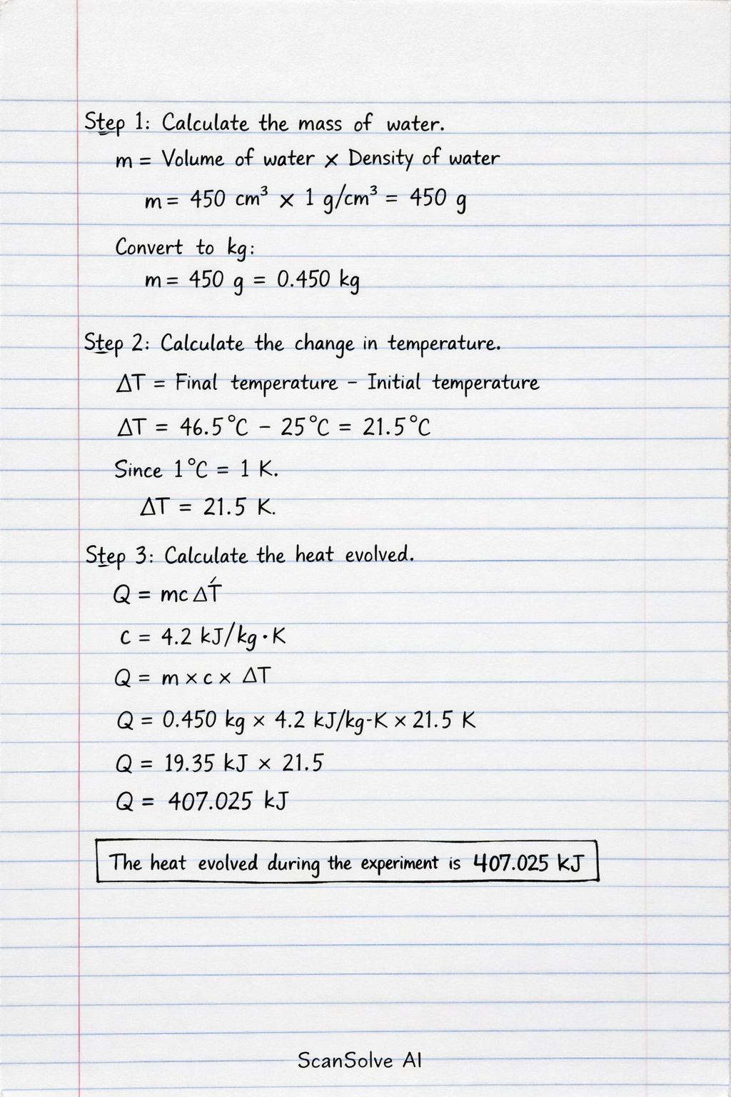 Step 3: Calculate the heat evolved using the formula . Given specific heat capacity of water .