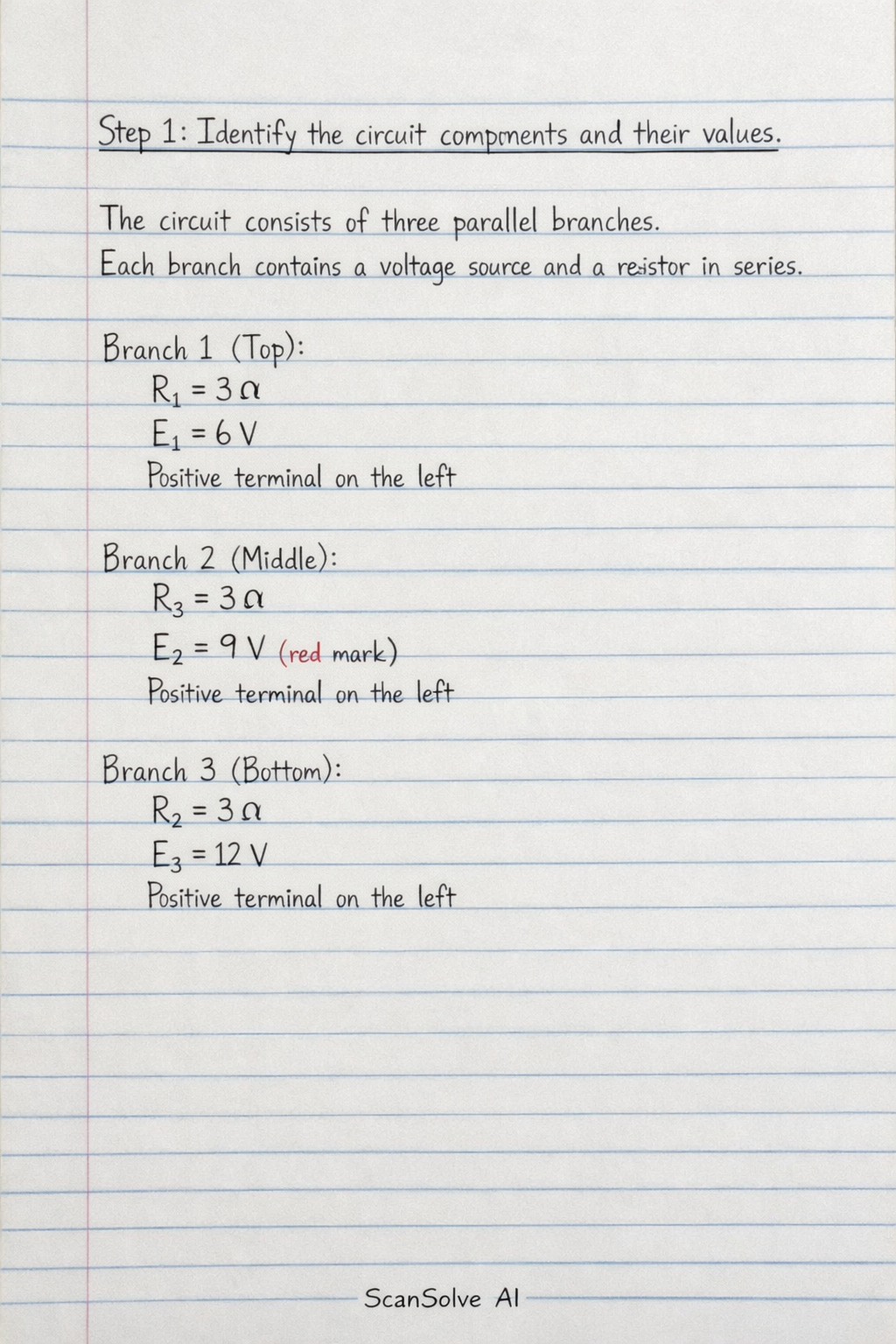 • Branch 2 (Middle): Resistor R3=3Ω, Voltage source E2=9V (assuming the red mark indicates the value). The positive terminal of E2 is on the left.
