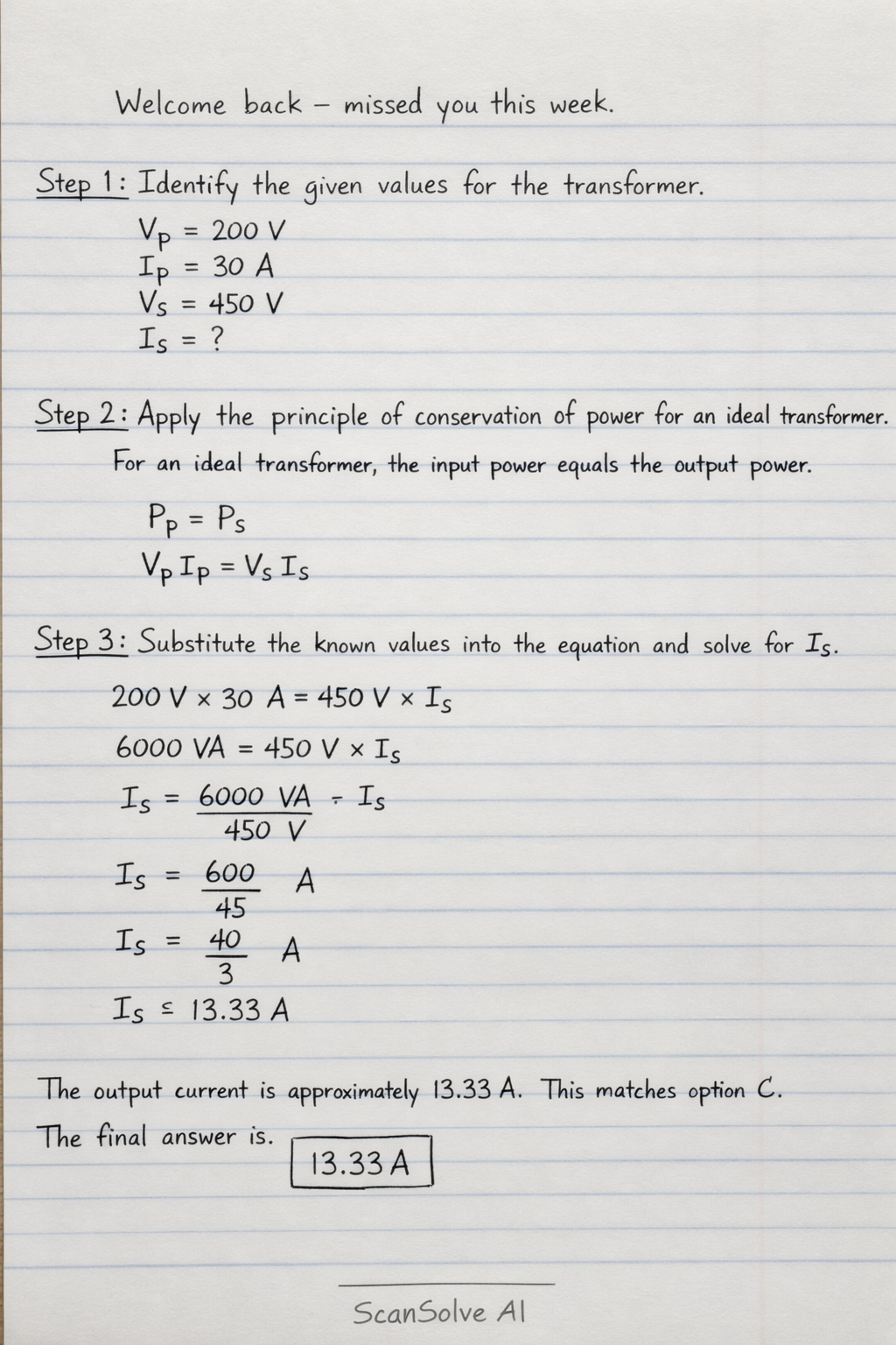 Step 2: Apply the principle of conservation of power for an ideal transformer.