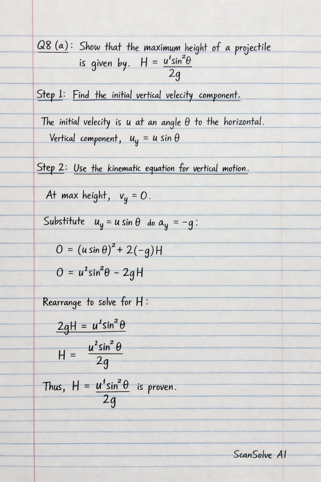 Q8 (a): Show that the maximum height of a projectile is given by H=2gu2sin2ΞΈβ.