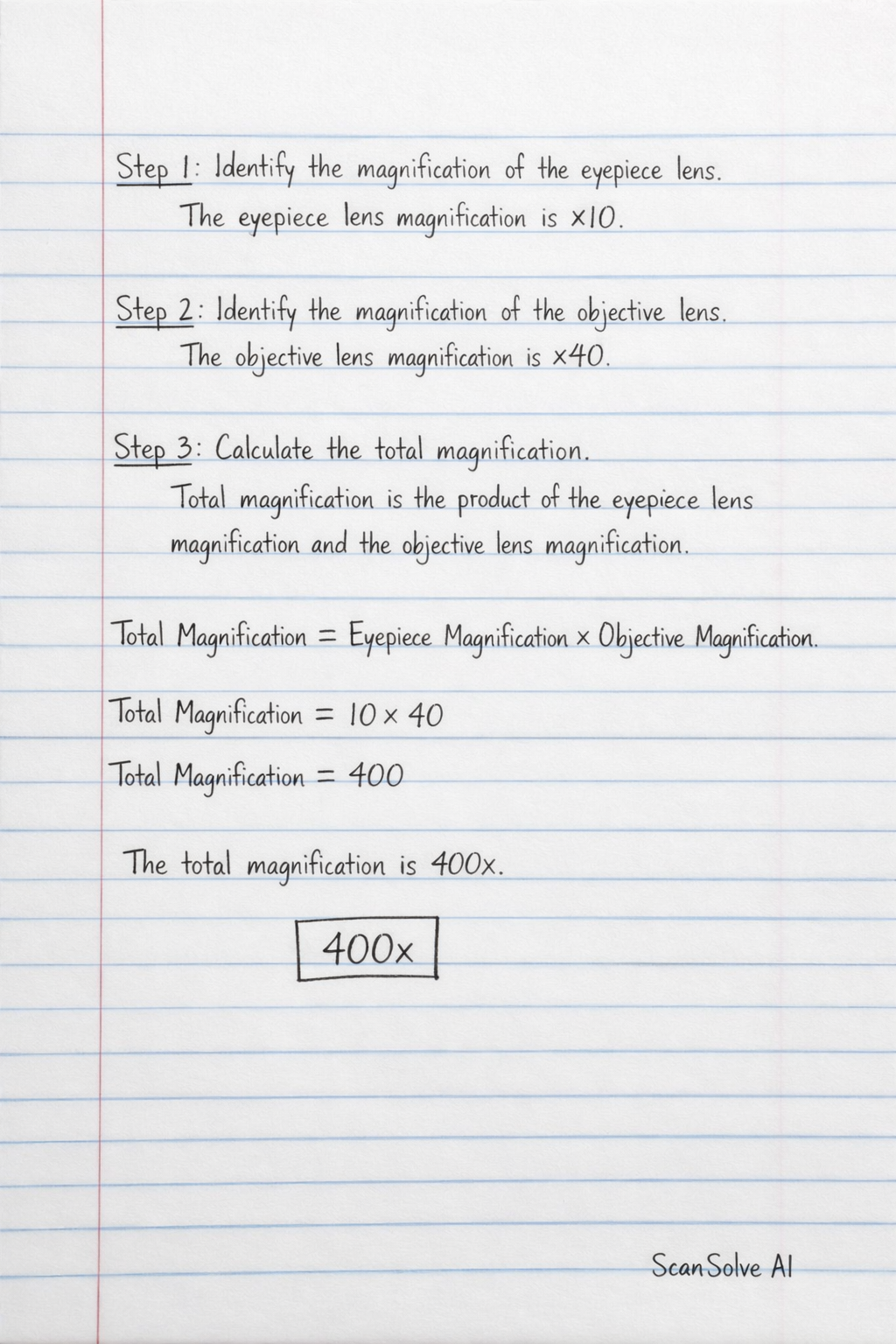 Step 3: Calculate the total magnification. Total magnification is the product of the eyepiece lens magnification and the objective lens magnification.