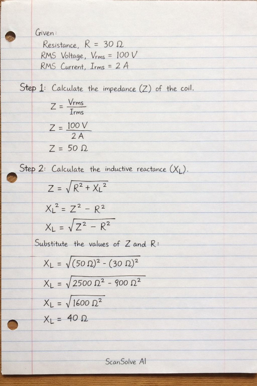 $$X_L = \sqrt{(50\, \Omega)^2 - (30\, \Omega)^2}$$