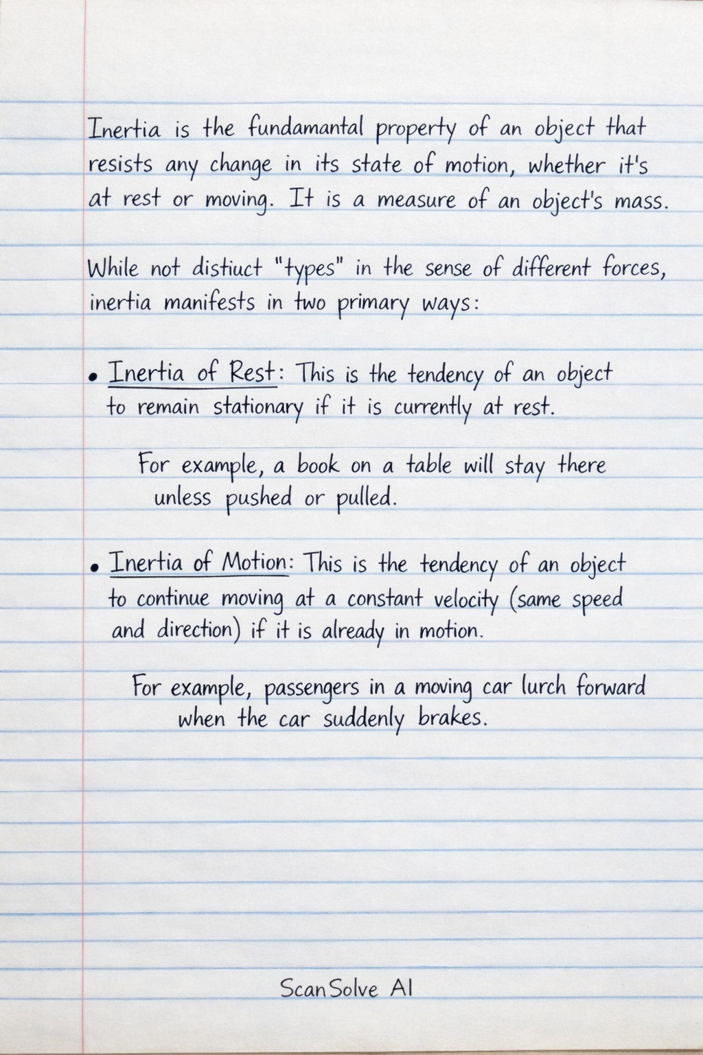 Inertia of Rest: This is the tendency of an object to remain stationary if it is currently at rest. For example, a book on a table will stay there unless pushed or pulled.