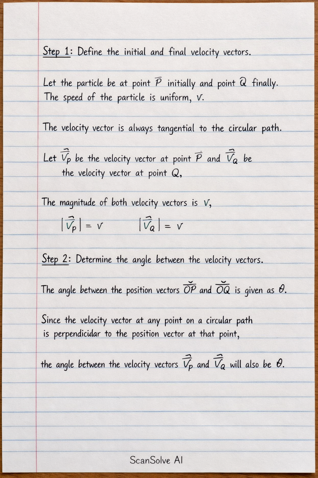 Since the velocity vector at any point on a circular path is perpendicular to the position vector at that point, the angle between the velocity vectors $\vec{v_P}$ and $\vec{v_Q}$ will also be $\theta$.
