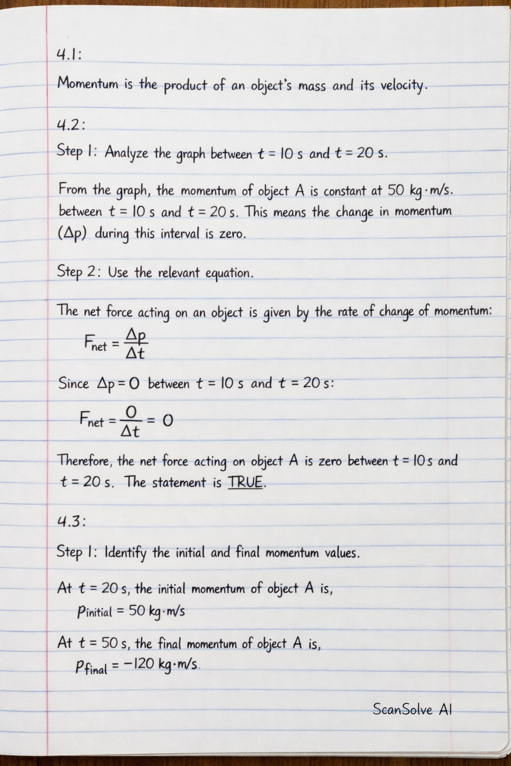 From the graph, the momentum of object A is constant at 50kg\cdotm⋯−1 between t=10 s and t=20 s. This means the change in momentum (Δp) during this interval is zero.