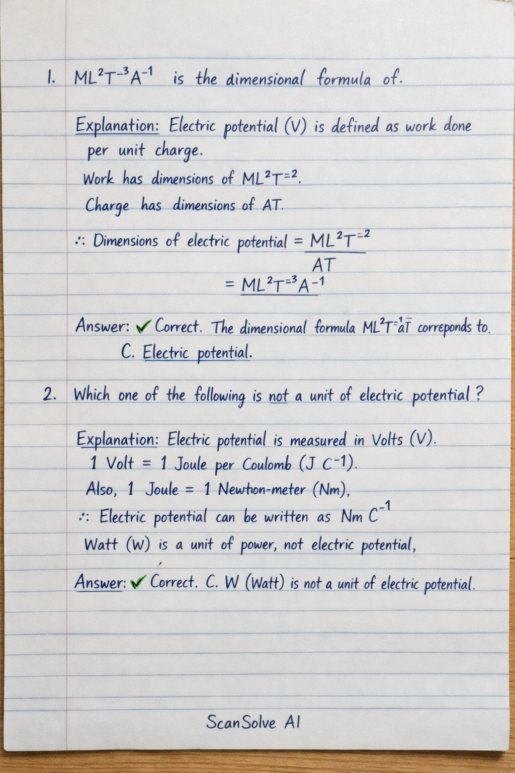 - Answer: ✅ Correct. The dimensional formula ML2T−3A−1 corresponds to C. Electric potential.