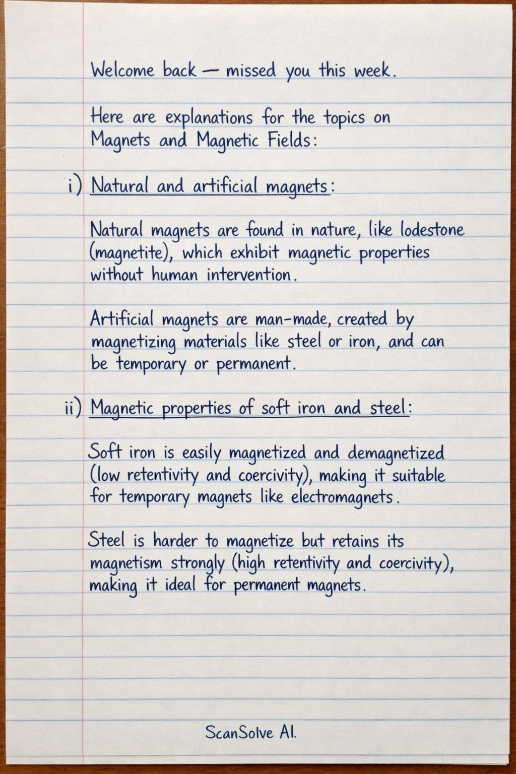 ii) Magnetic properties of soft iron and steel: Soft iron is easily magnetized and demagnetized (low retentivity and coercivity), making it suitable for temporary magnets like electromagnets. Steel* is harder to magnetize but retains its magnetism strongly (high retentivity and coercivity), making it ideal for permanent magnets.