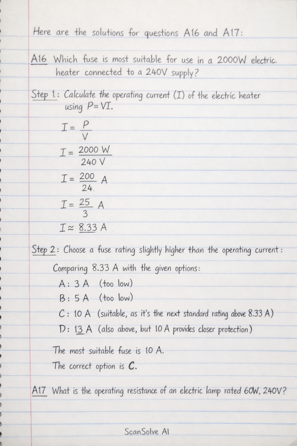 A16 Which fuse is most suitable for use in a 2000W electric heater connected to a 240V supply?
