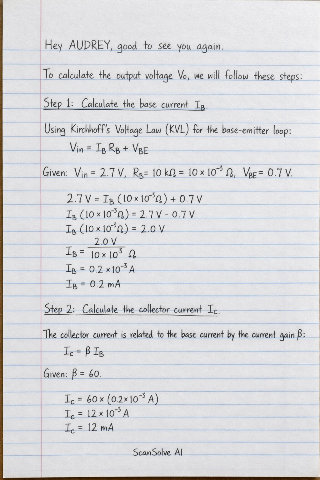 Hey AUDREY, good to see you again. To calculate the output voltage V_o, we will follow these steps: Step 1: Calculate the base current I_B.