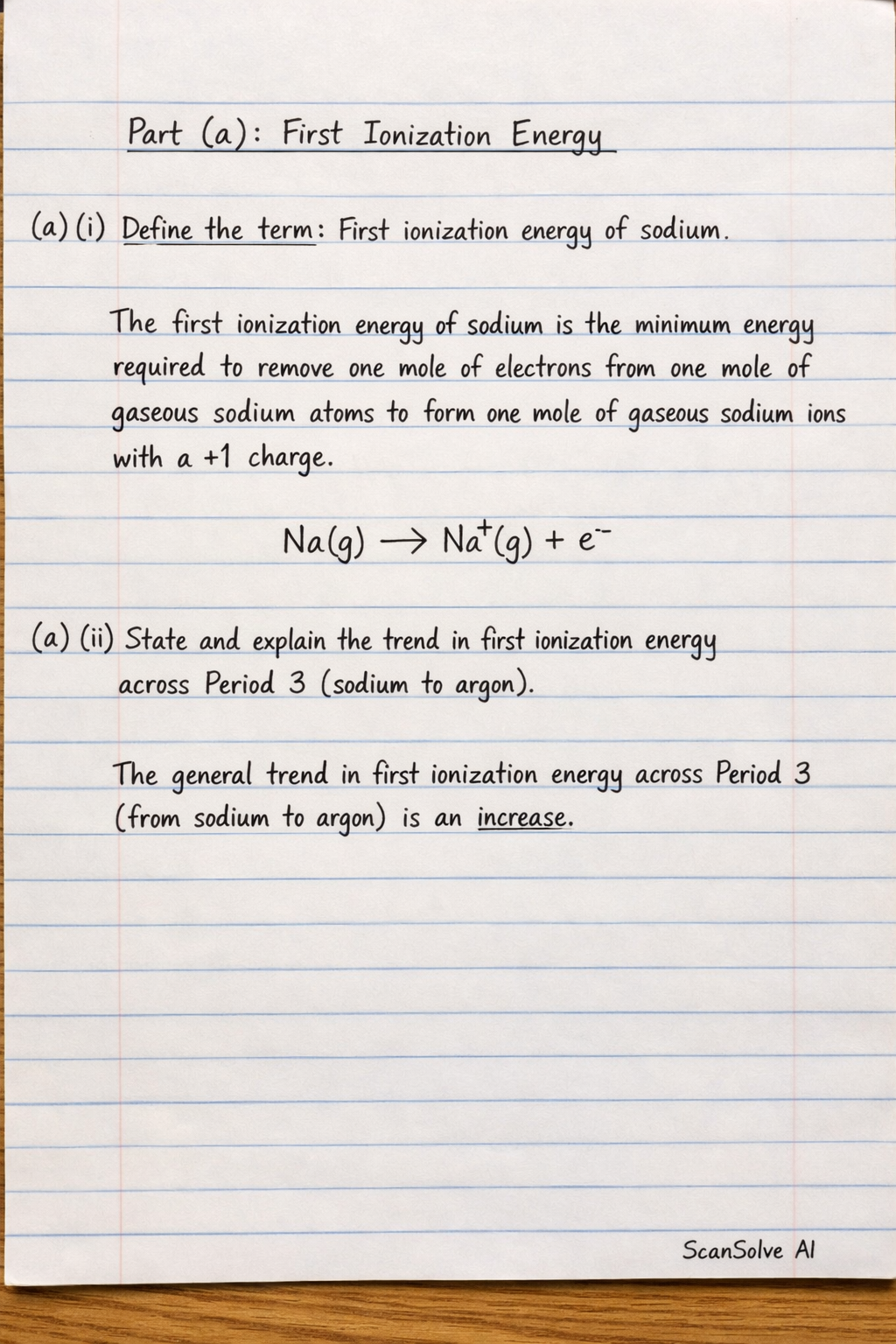 a) (ii) State and explain the trend in first ionization energy across Period 3 (sodium to argon). The general trend in first ionization energy across Period 3 (from sodium to argon) is an increase.