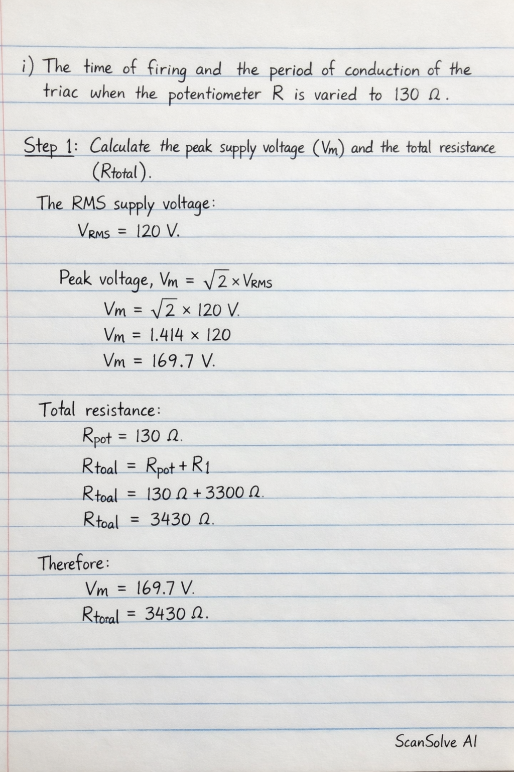 Step 1: Calculate the peak supply voltage () and the total resistance (). The RMS supply