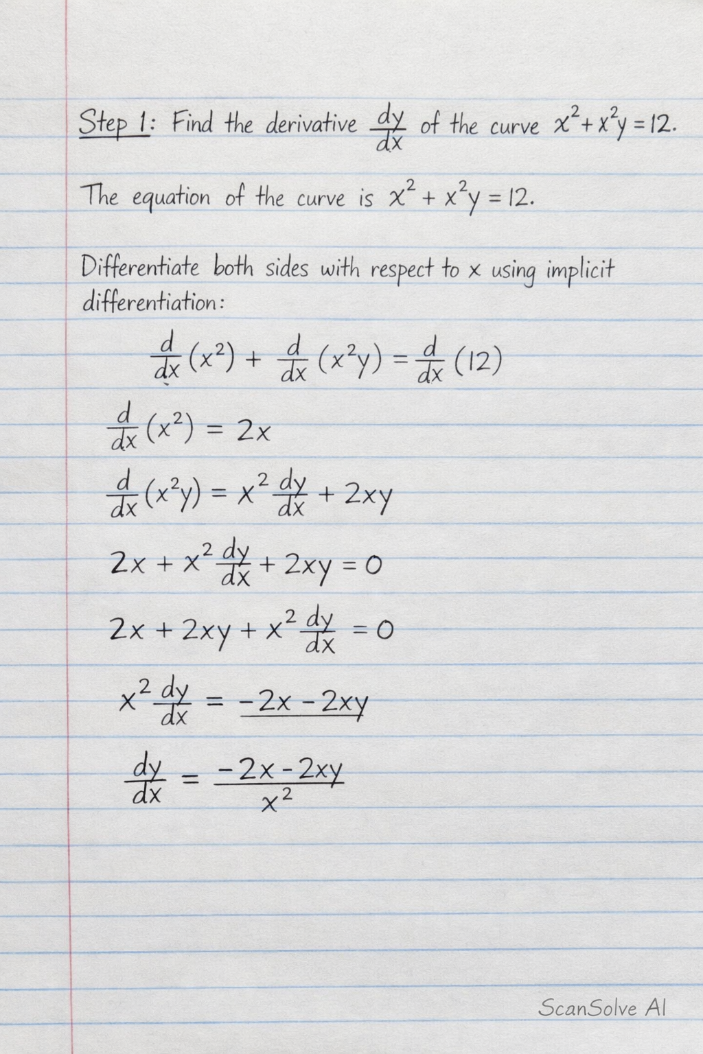 Step 1: Find the derivative $\frac{dy}{dx}$ of the curve $x^2 + x^2y = 12$.