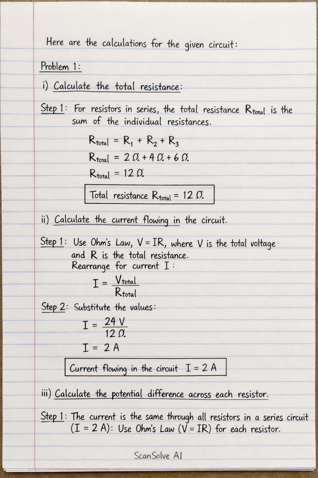 Problem 1: Resistors of 2Ω, 4Ω, and 6Ω are connected in series, and a voltage of 24 V is applied across them.