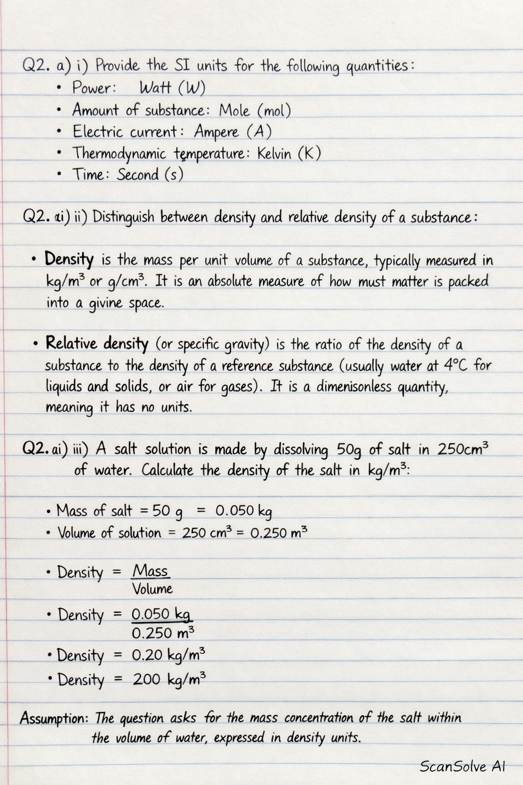 Q2. a) iii) A salt solution is made by dissolving 50g of salt in 250cm³ of water. Calculate the density of the salt in kg/m³.
