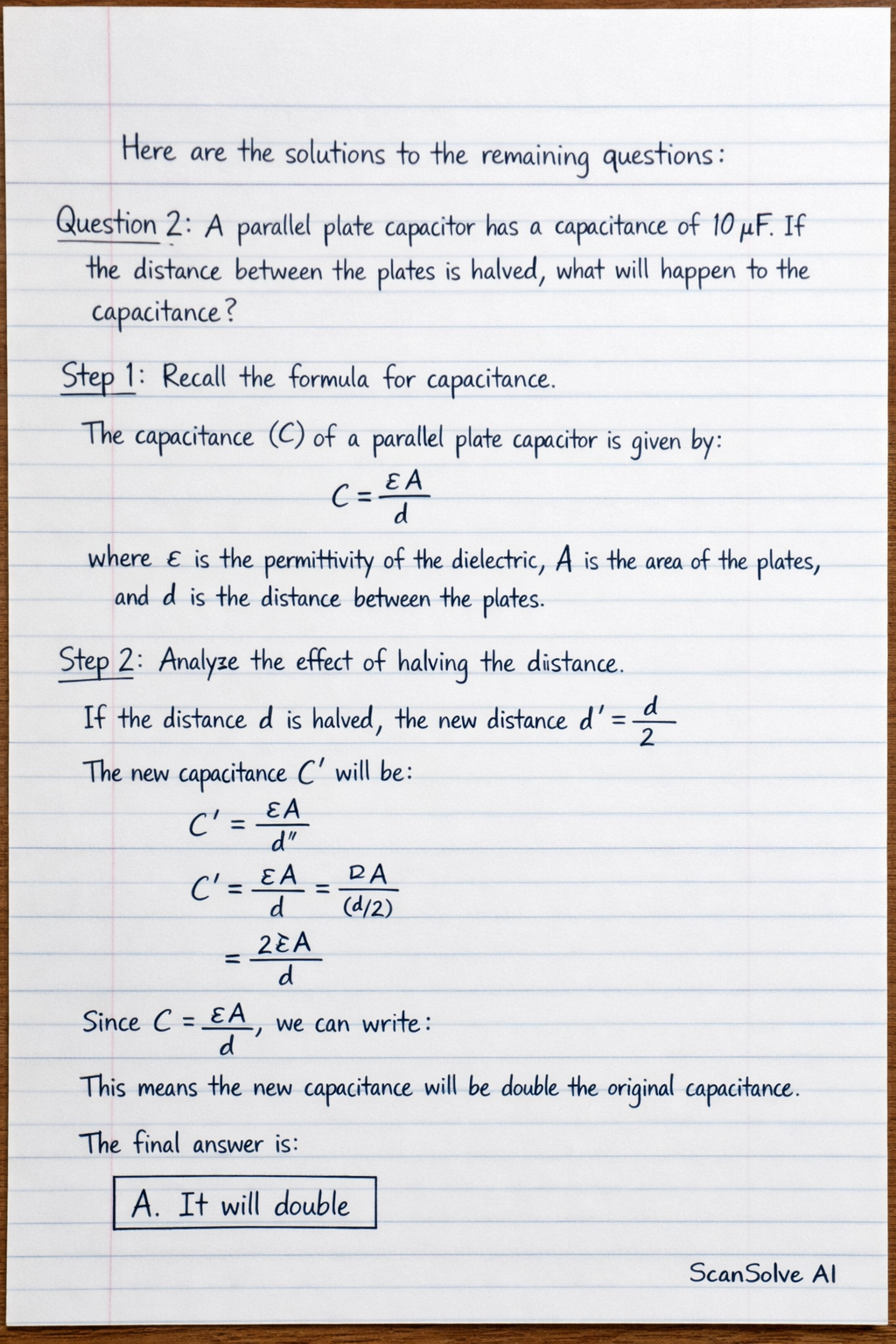 Question 2: A parallel plate capacitor has a capacitance of 10μF. If the distance between the plates is halved, what will happen to the capacitance?