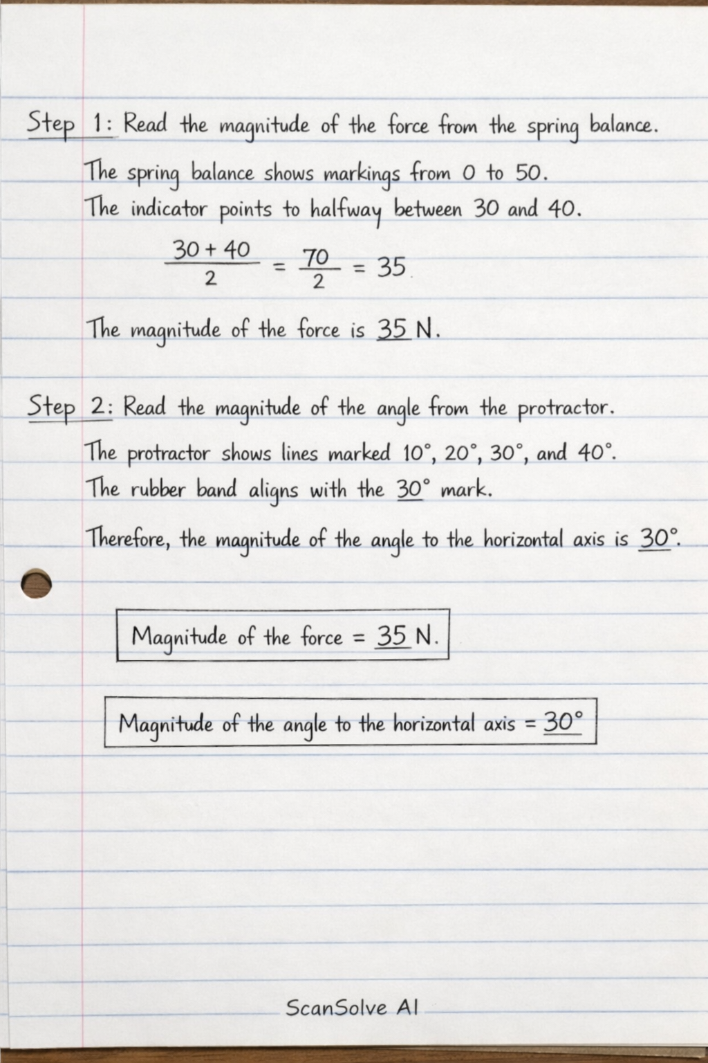 The spring balance shows markings from 0 to 50. The indicator points to the mark exactly halfway between 30 and 40.