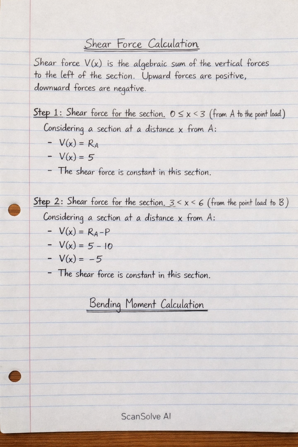 Step 1: Shear force for the section (from A to the point load). Considering a section at a distance from A: The shear force is constant in this section.