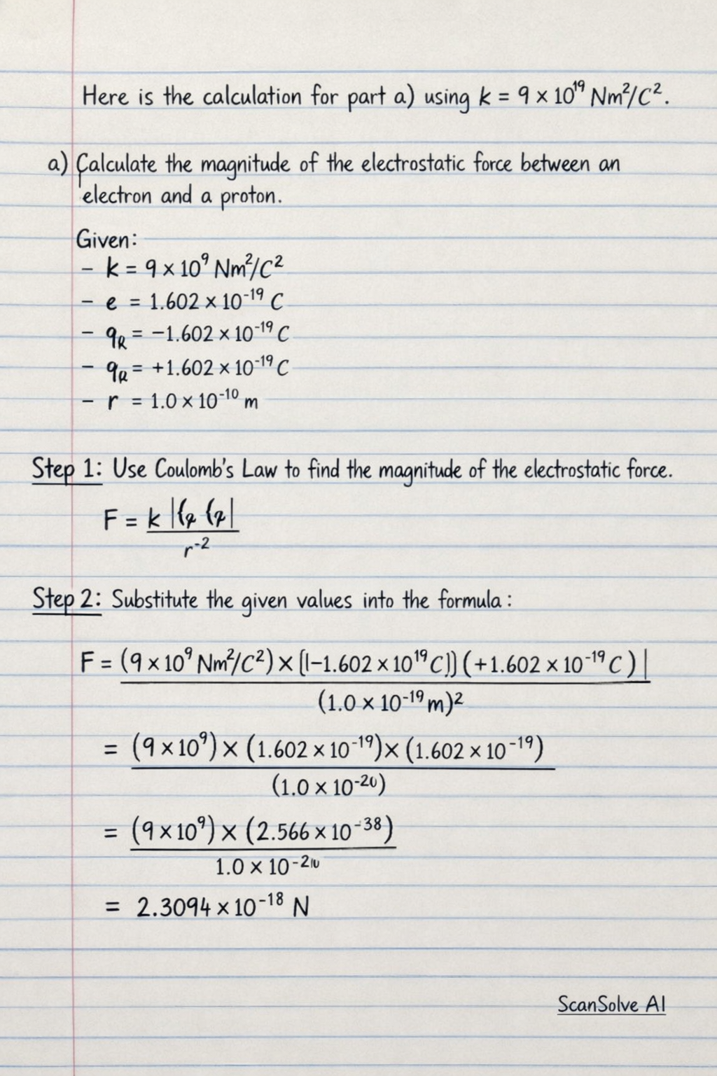 a) Calculate the magnitude of the electrostatic force between an electron and a proton.