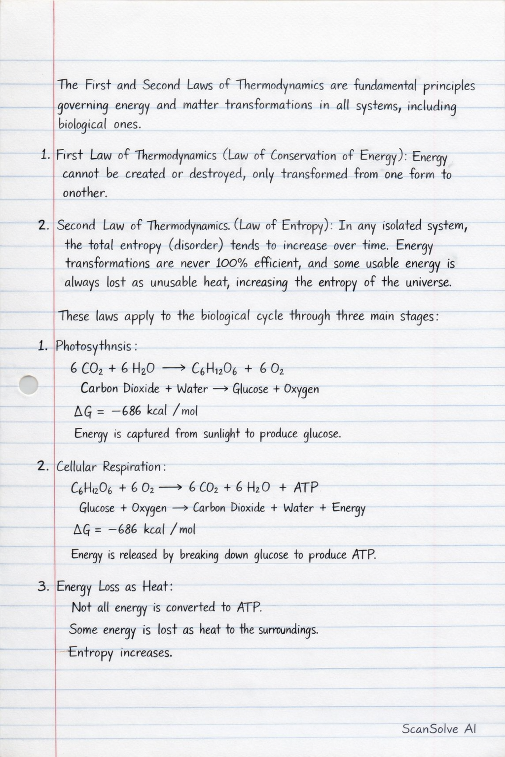 - First Law: Organisms convert the captured chemical energy into other forms to power life processes (e.g., ATP synthesis, muscle contraction, nerve impulses). The total energy within the organism and its surroundings remains conserved.