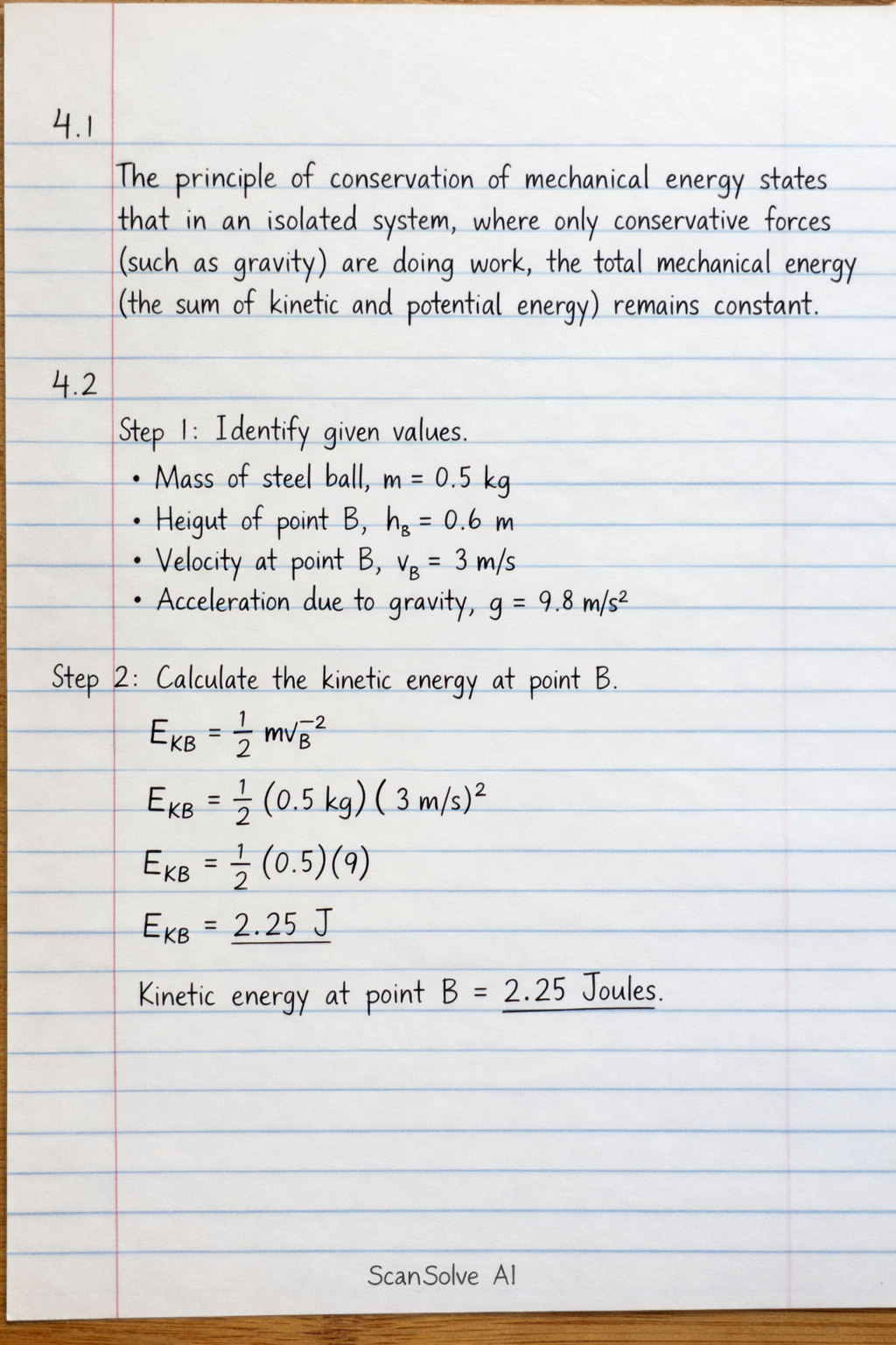 4.2 Step 1: Identify given values. Mass of steel ball, Height of point B, Velocity at point B, Acceleration due to gravity,