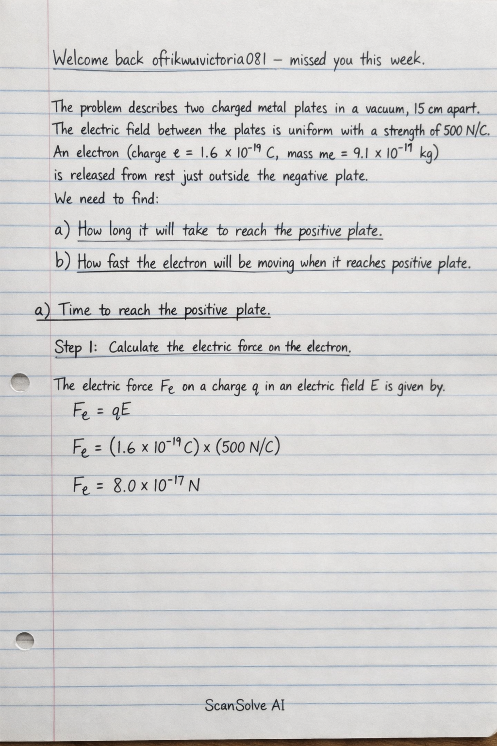 $$F_e = (1.6 \times 10^{-19} \, \text{C}) \times (500 \, \text{N/C})$$